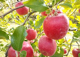 朝霧が立ち込める時期、日中と夜温との気温差により糖度が増し、西向きの傾斜地は夕方まで陽が当たると夕日に負けないくらい真っ赤でおいしい蜜入り林檎が出来ます。